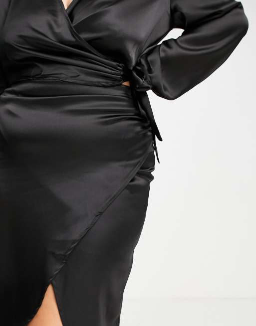 Black satin wrap skirt backless midi dress outlet.